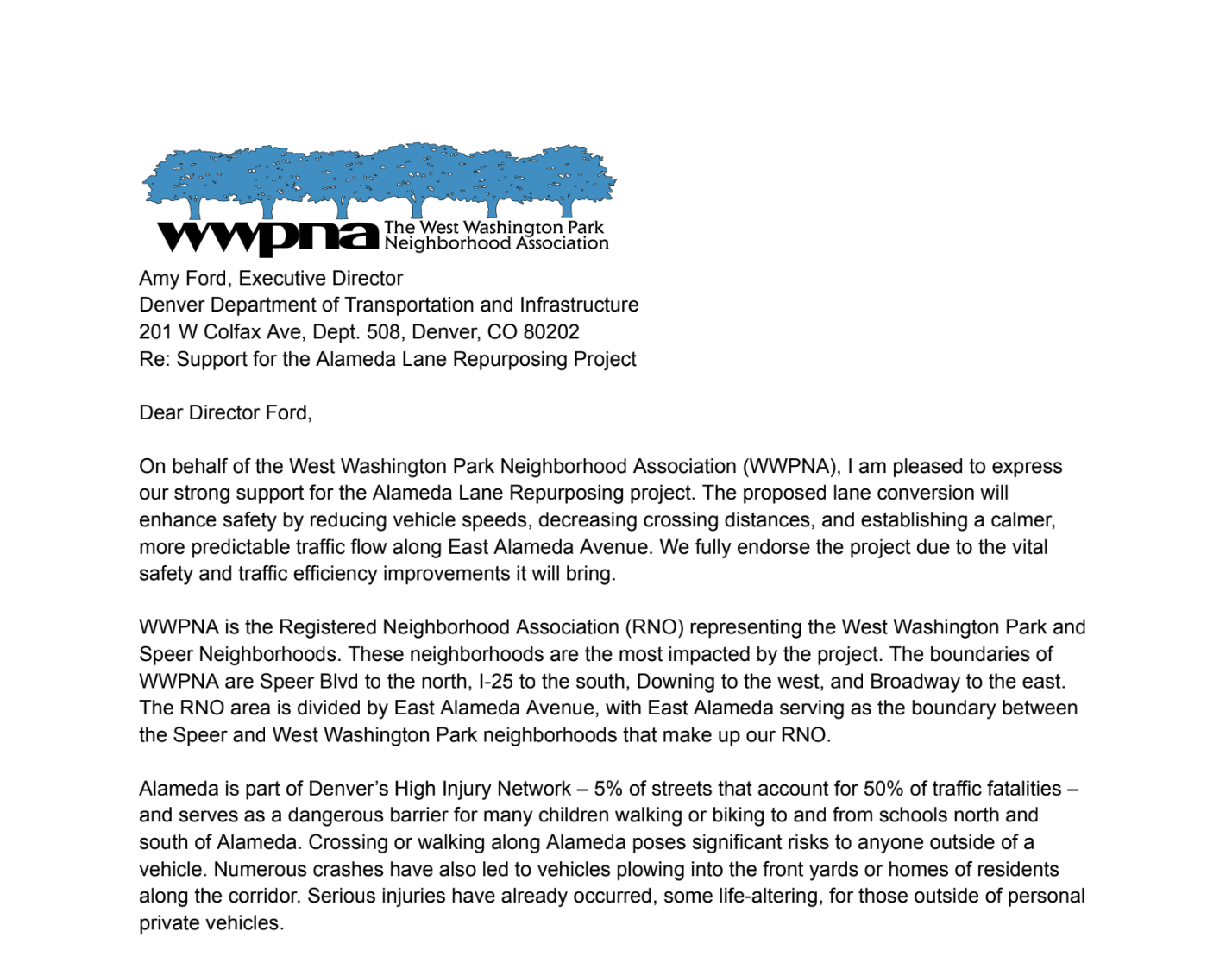 WWPNA Letter to Amy Ford, DOTI Director, in support of the ORIGINAL 4 to 3 lane conversion (September 4, 2025)